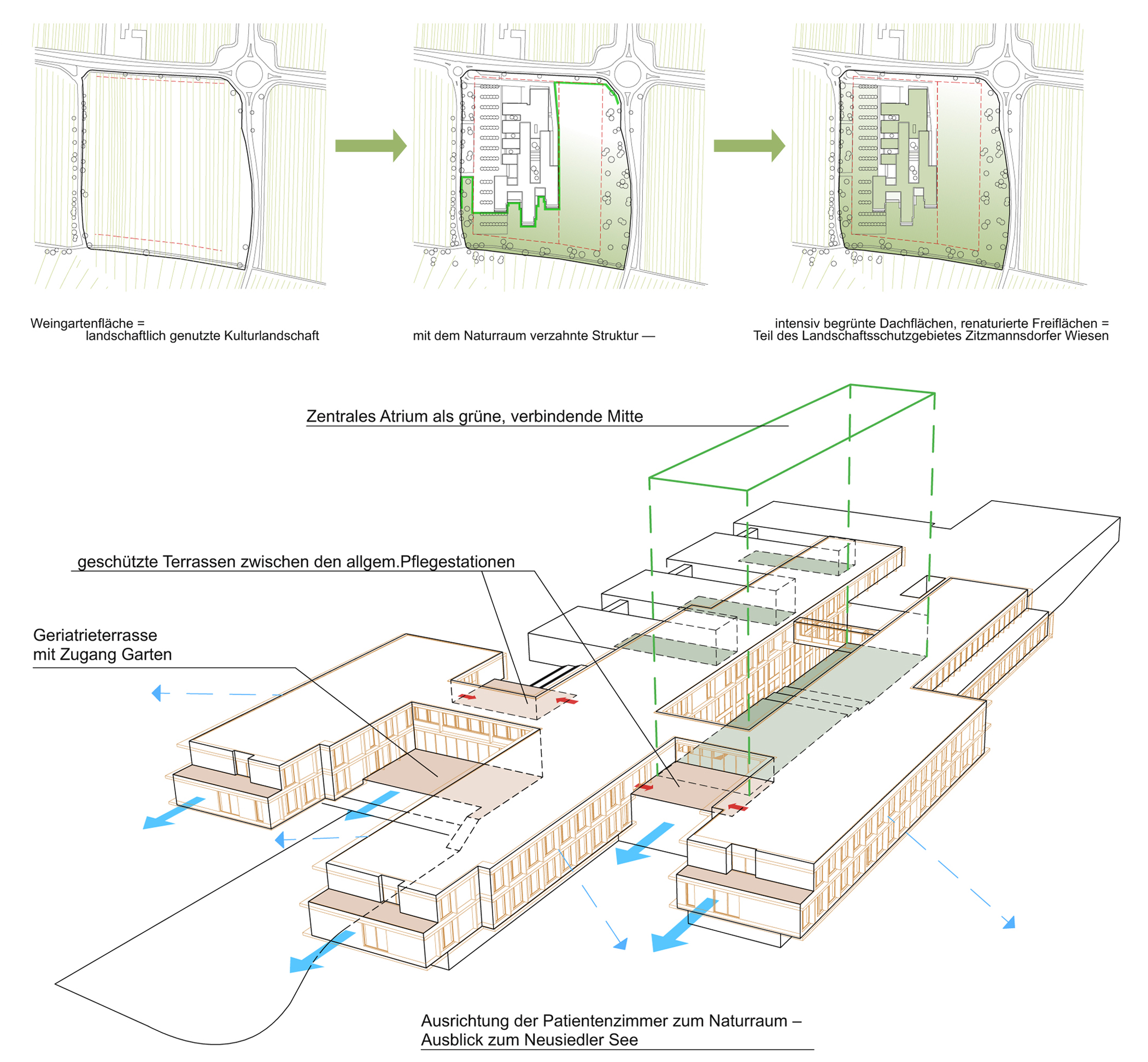 Eine niedrige Bebauung „überformt“ durch ihre Ausformulierung die bestehende Weingartenfläche und macht sie – unterstützt durch die Renaturierung der verbleibenden Freiflächen – zum Bestandteil des Landschaftsschutzgebietes Zitzmannsdorfer Wiesen. Weite Ausblicke an seiner Süd-West-Seite machen diese Verzahnung mit der Landschaft erlebbar und schaffen ein mit der Natur verbundenes Umfeld für die Patienten.