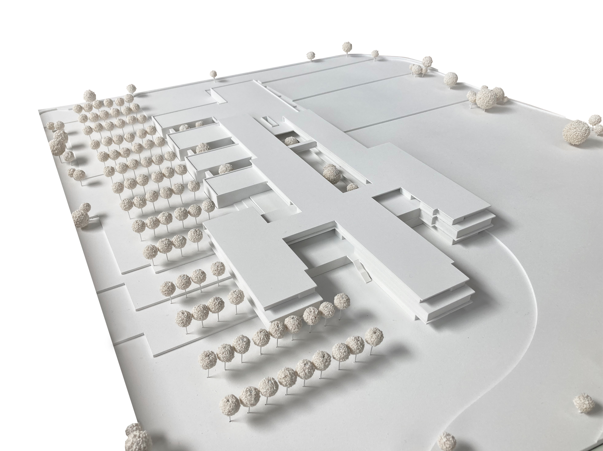 Die vorgeschlagene, flache Bebauung begünstigt die internen, funktionalen Bezüge. Sie ermöglicht Anpassungen, sowohl innerhalb ihrer Struktur als auch der Gebäudevolumen, und ist auf dem angrenzenden Baufeld (S-AKA2) erweiterbar. Die geplanten Atrien unterstützen die natürliche Belichtung und eine Querlüftung der Anlage.